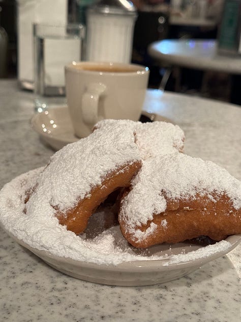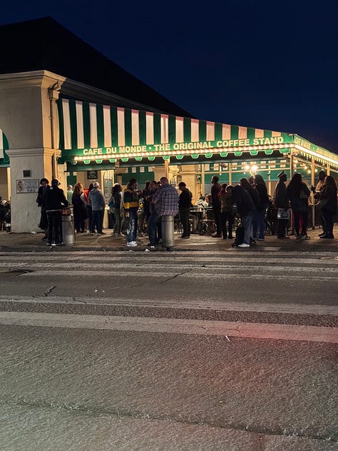 Later that evening, I stopped by Cafe du Monde for beignets and a classic cup of coffee with chicory. I then walked along Decatur, chatting with a friend on the phone as I popped into souvenir shops. As I approached Frenchman Street, the sound of a brass band playing Lauryn Hill wafted through the window of a bar. I ordered a Sazerac and danced until the band finished their set. I bar-hopped for the next few hours, chasing the music and a vibe.