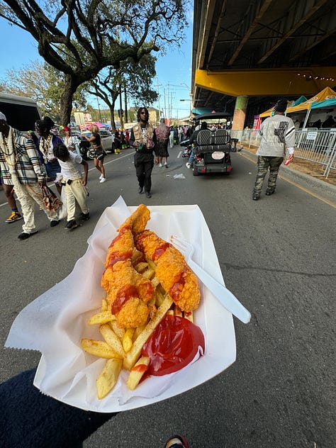 The bridge was a twenty-minute walk from the hotel. I stopped at a cafe en route to pick up a latte for the journey. The bridge was located at the end of the parade route. As the floats came through, the Zulus threw medallions, umbrellas, coconuts, and toys into the crowd. The motorcycles revved feet away from mom-and-pop food vendors selling made-to-order fried wings, fish, gumbo, and cocktails from folding tables. Local artists performed, and they led the packed crowd through a call and response of twerking, stepping, and rhyming about “dog ass niggas.”