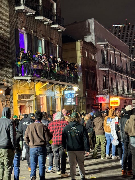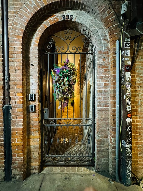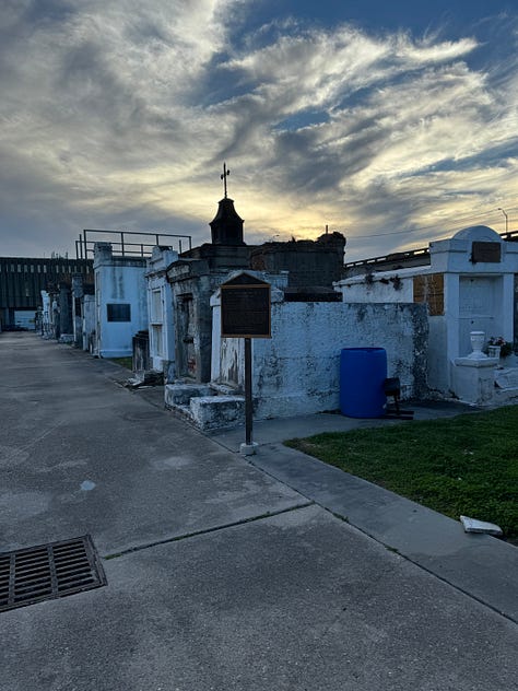 People's parasocial relationship with celebrities only increases when they forget that just because they have seen the inside of someone’s orifices on screen, we don’t actually know one another. I disappeared down Bourbon Street, cautiously and carefully, chatting with a friend in my AirPods as I walked around the French Quarter, getting my bearings and familiarizing myself with varied routes to my hotel. The tourists were out in full revelry, drinking foot-long sugar-filled frozen cocktails and flashing for beads. I climbed into bed after 3:00 a.m., hopeful to get up two hours later for the Skull & Bones walk.