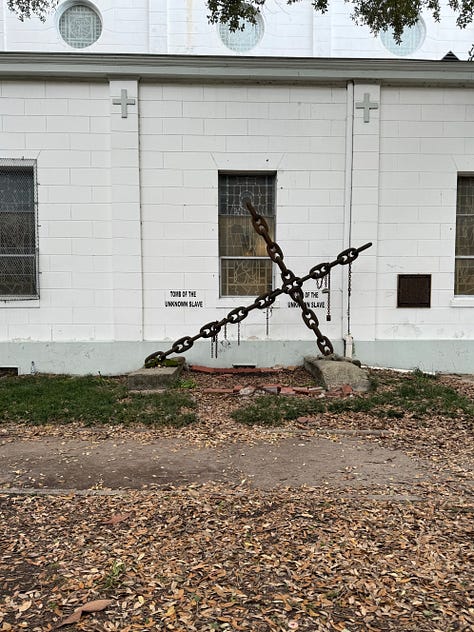 The energy around the church was potent. Being able to touch the weathered shackles and chains of the shrine in the garden of the church was a reminder of how our ancestors often found comfort and healing amidst the brutal realities of enslavement. I had hoped to see and touch the original pews purchased by free Africans during the War of the Pews so the families of freemen and enslaved Africans could worship, but the main chapel was closed for repairs caused by Hurricane Ida. I hadn’t been to Catholic Mass since childhood. Sitting in the parish hall, I followed along in the Liturgy of the Word, received the Eucharist, and sobbed as I said prayers for my late father and other ancestors.